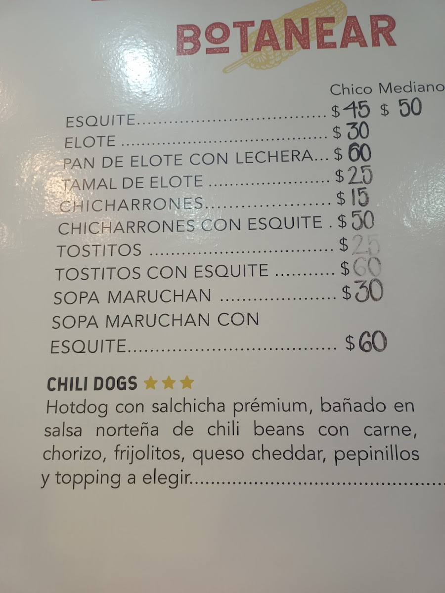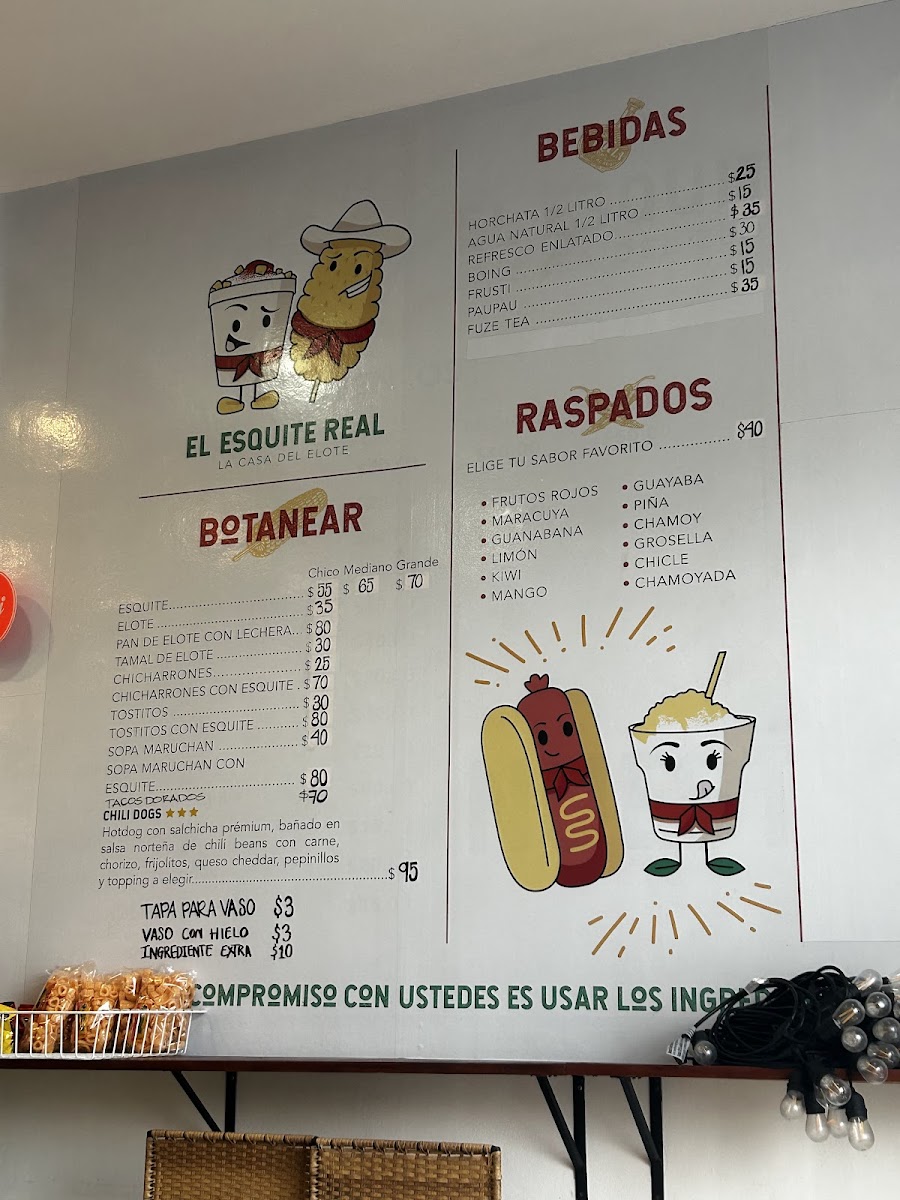 - Signature dishes: Esquites in cup, elotes, tamales de elote